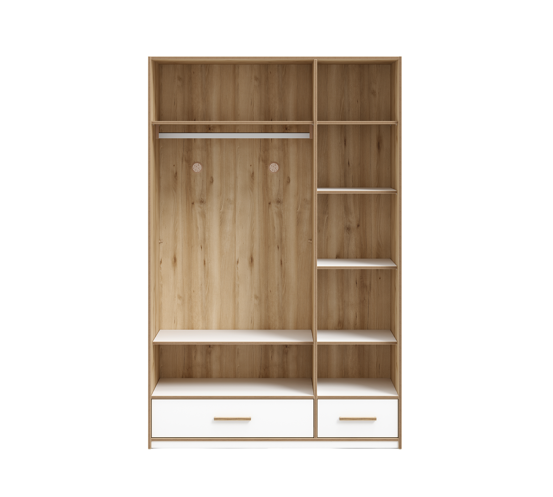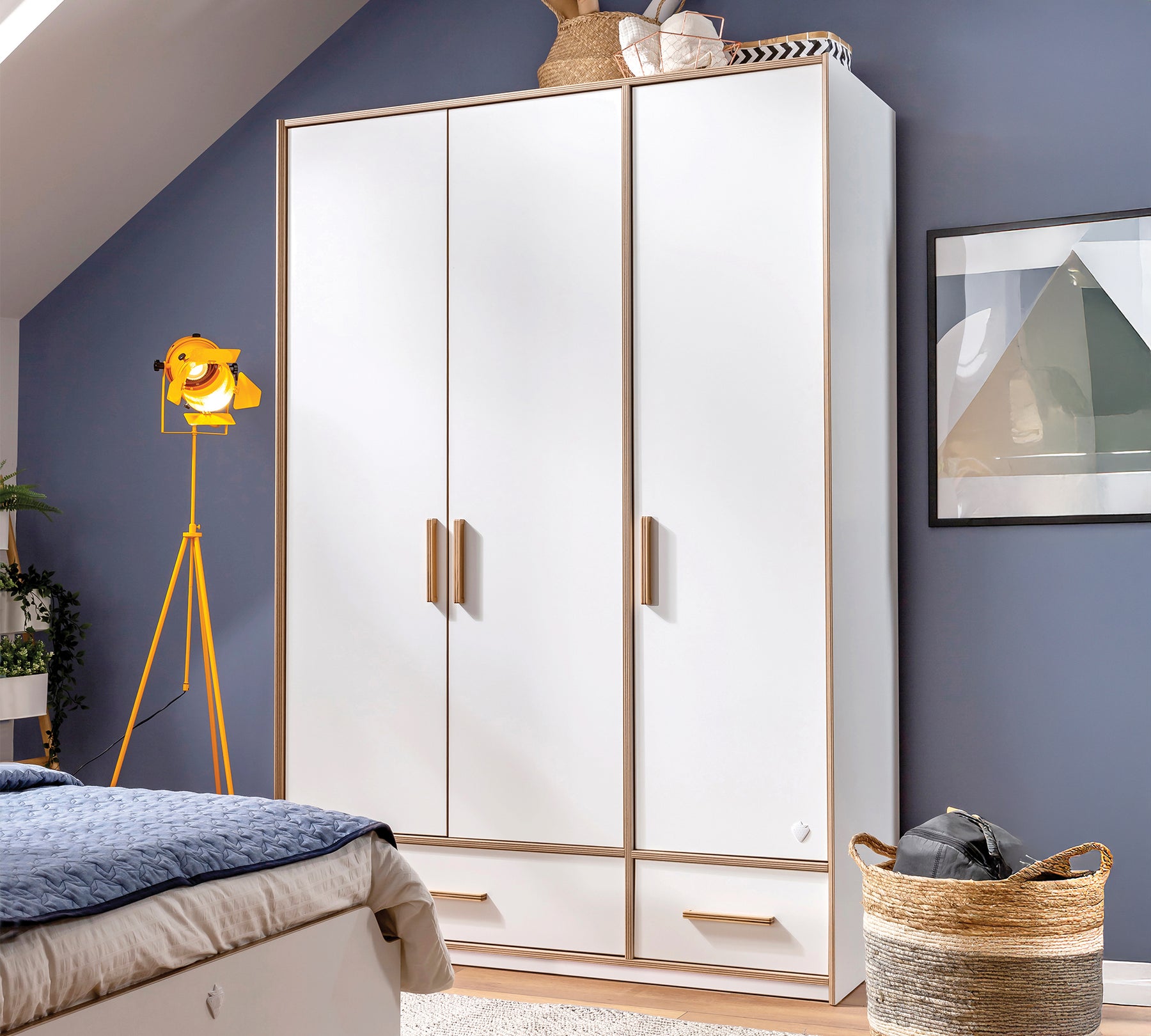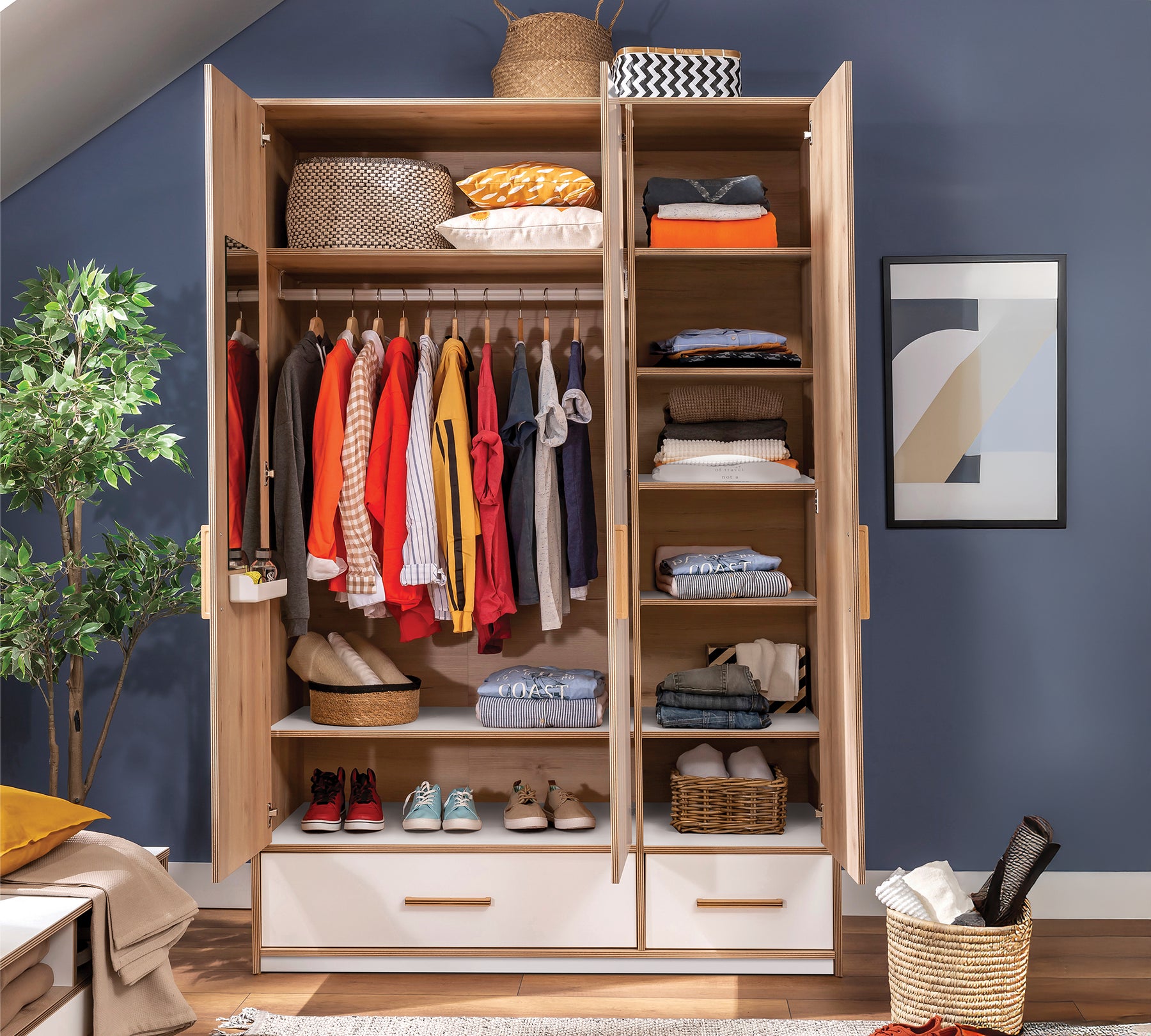 Kayın ve ceviz renk ahşap kulpları, ayarlanabilir raf sistemi, geniş elbise askılığı, havalandırma kapsülleri, bölmeli çekmeceleri, kapak içindeki sportif aynası, kişisel eşyalar için konumlandırılan bölmesi ile şıklık kazanan Modera 3 Kapılı Dolap, geniş kullanım imkanı sunar. Daha güvenli bir kullanım için dolapla birlikte gelen duvar bağlantı aparatının kullanılması tavsiye edilir.