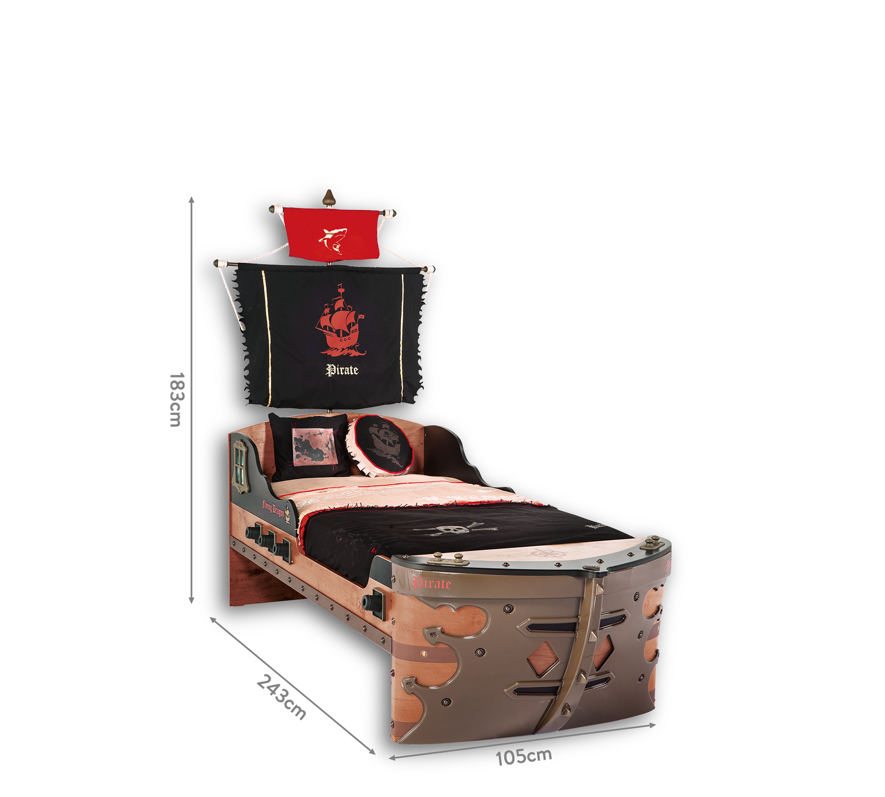 Karyola başlığına takılan flama ile tam bir korsan gemisine dönüşen karyola, alt kısmında bulunan boşluğa alt karyola da koyarak kullanıma çeşitlilik kazandırır.