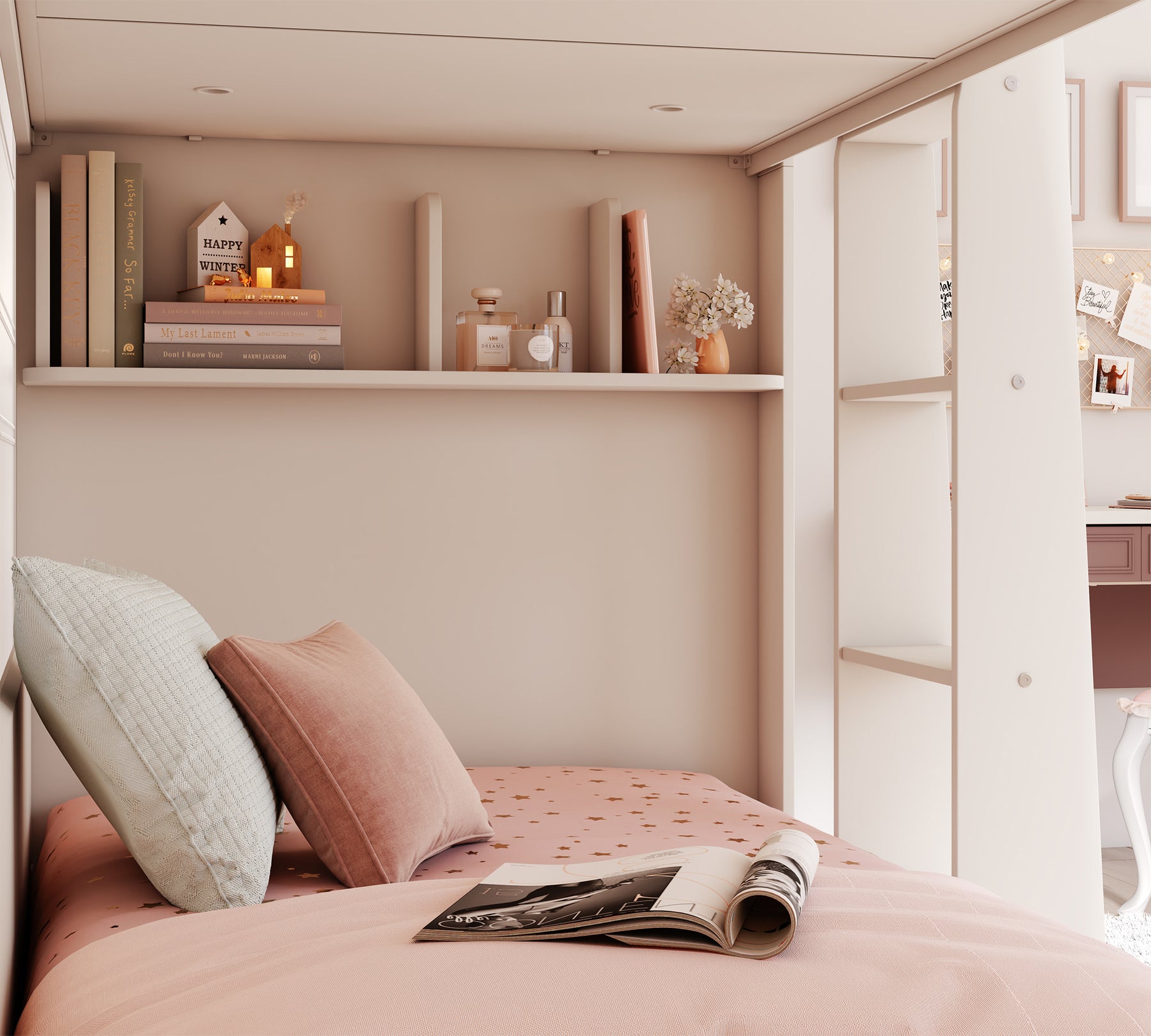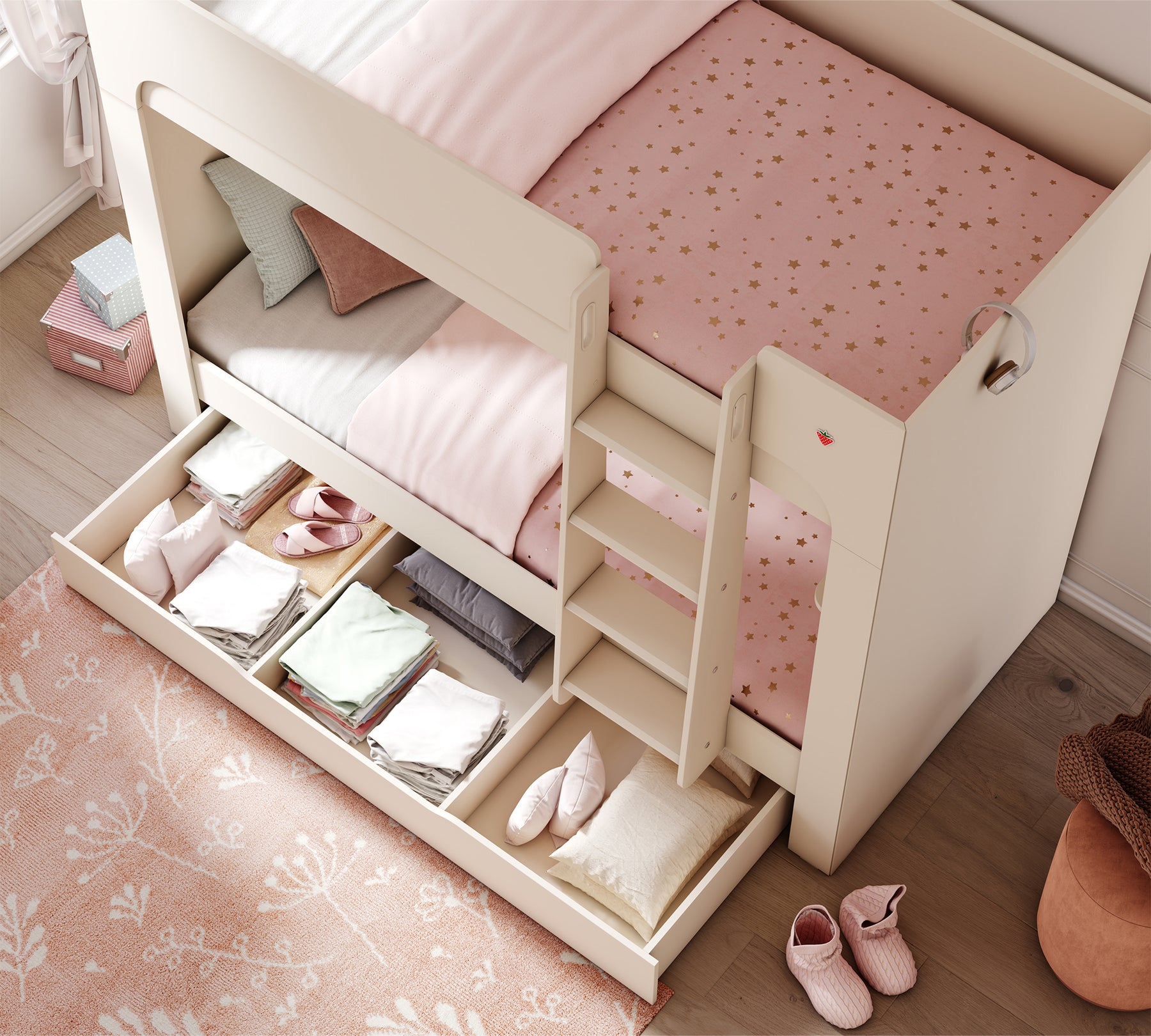Kompakt yüksekliği sayesinde ranzanın altına mükemmel şekilde sığar ve odanızda fazladan alan yaratır. Hem estetik uyumuyla ranzayı tamamlar, hem de pratik kullanım avantajıyla odanızın düzenini artırır.